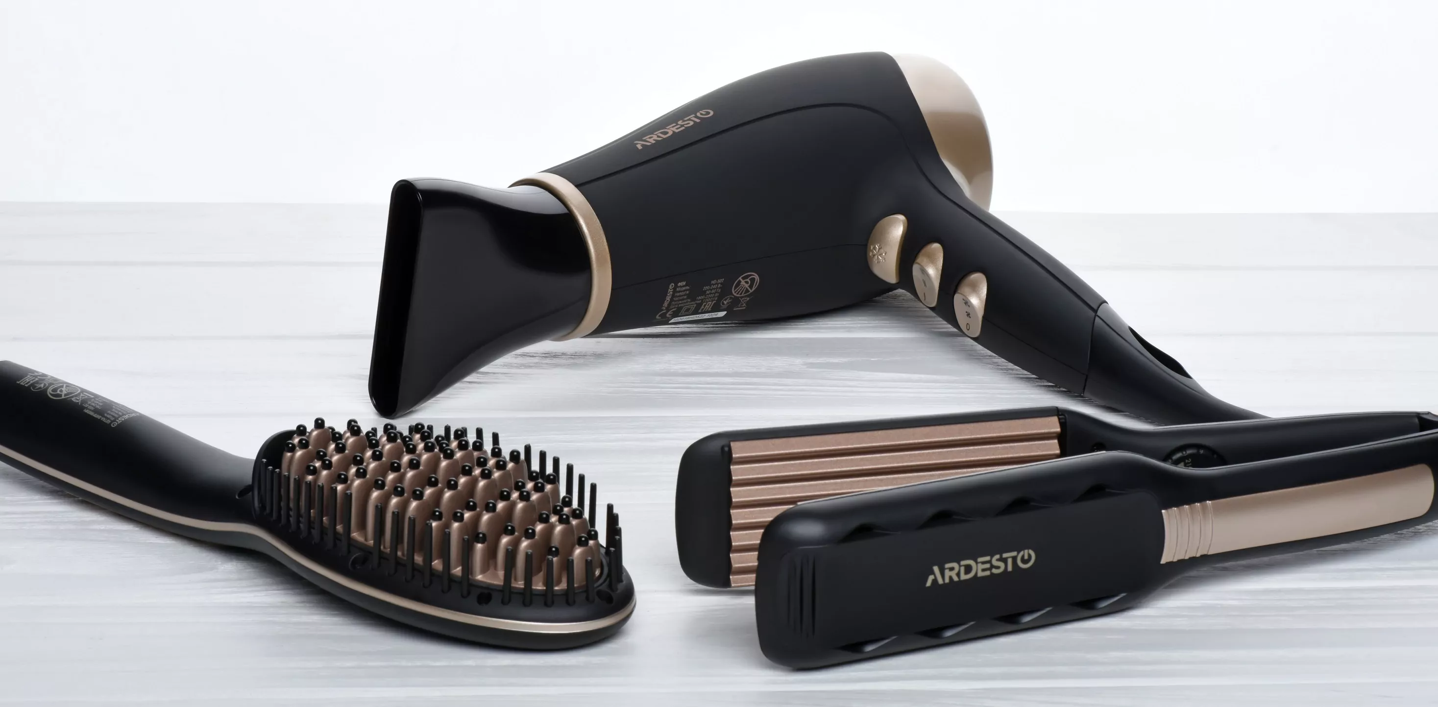 Асортимент бренду Ardesto розширився новими товарами для краси і здоров’я. Тепер для вас доступні фени, різноманітні плойки, а також щітка-випрямляч. Усі новинки виконанні у преміальній чорно-золотій кольоровій гаммі з міцного полікарбонату, а нагрівальні елементи отримали керамічне покриття.