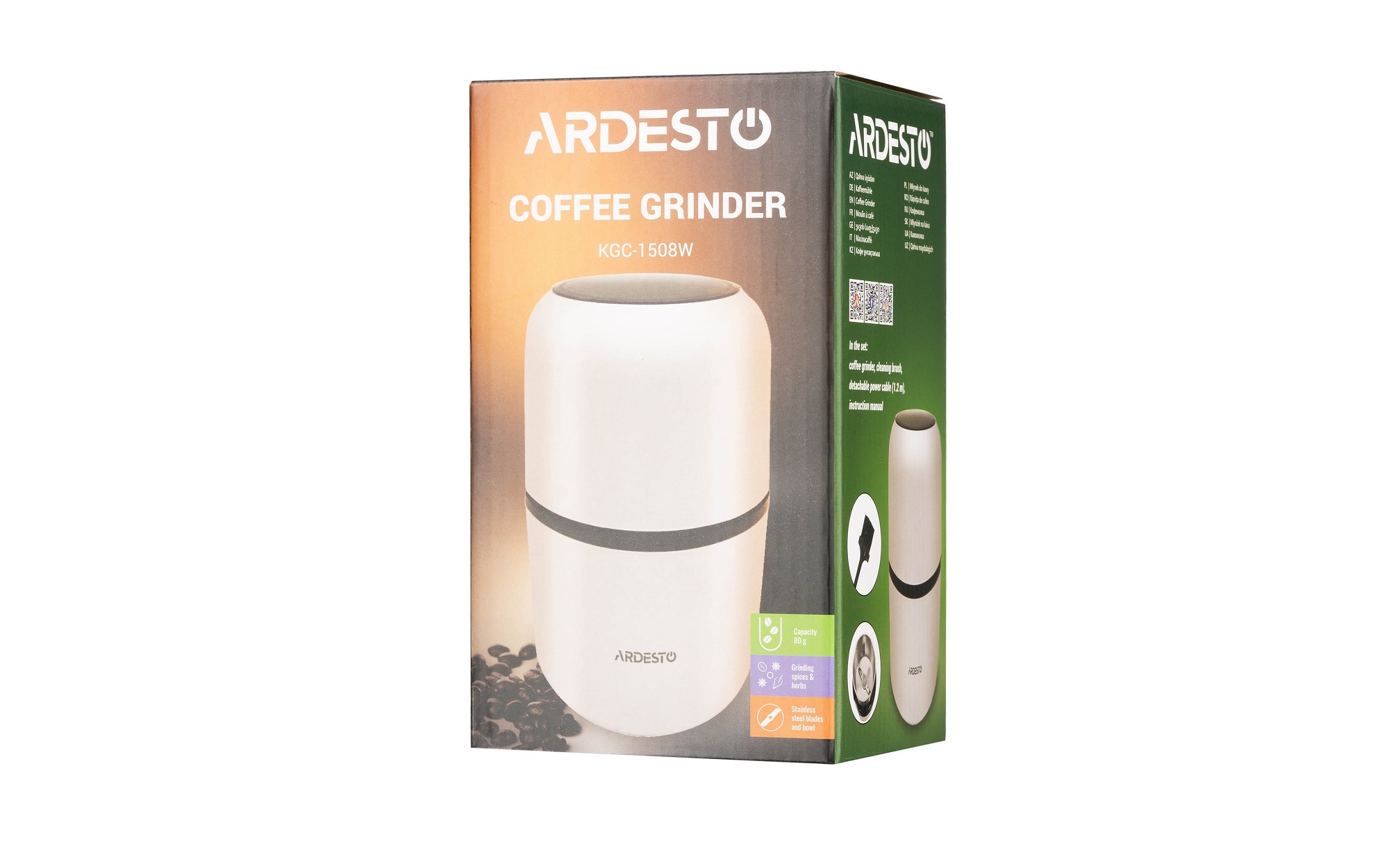 Do you like when the morning starts with the invigorating aroma of freshly ground coffee? Then you should pay attention to the ARDESTO KGC-1508W rotary coffee grinder, which can grind 80 g of beans at one time, and if necessary, it can handle spices and nuts. Long blades and stainless steel grinding bowl in an ergonomic white plastic body. The structure is stable thanks to rubber feet. With a 1.2 m cable, you can connect anywhere there is an outlet.