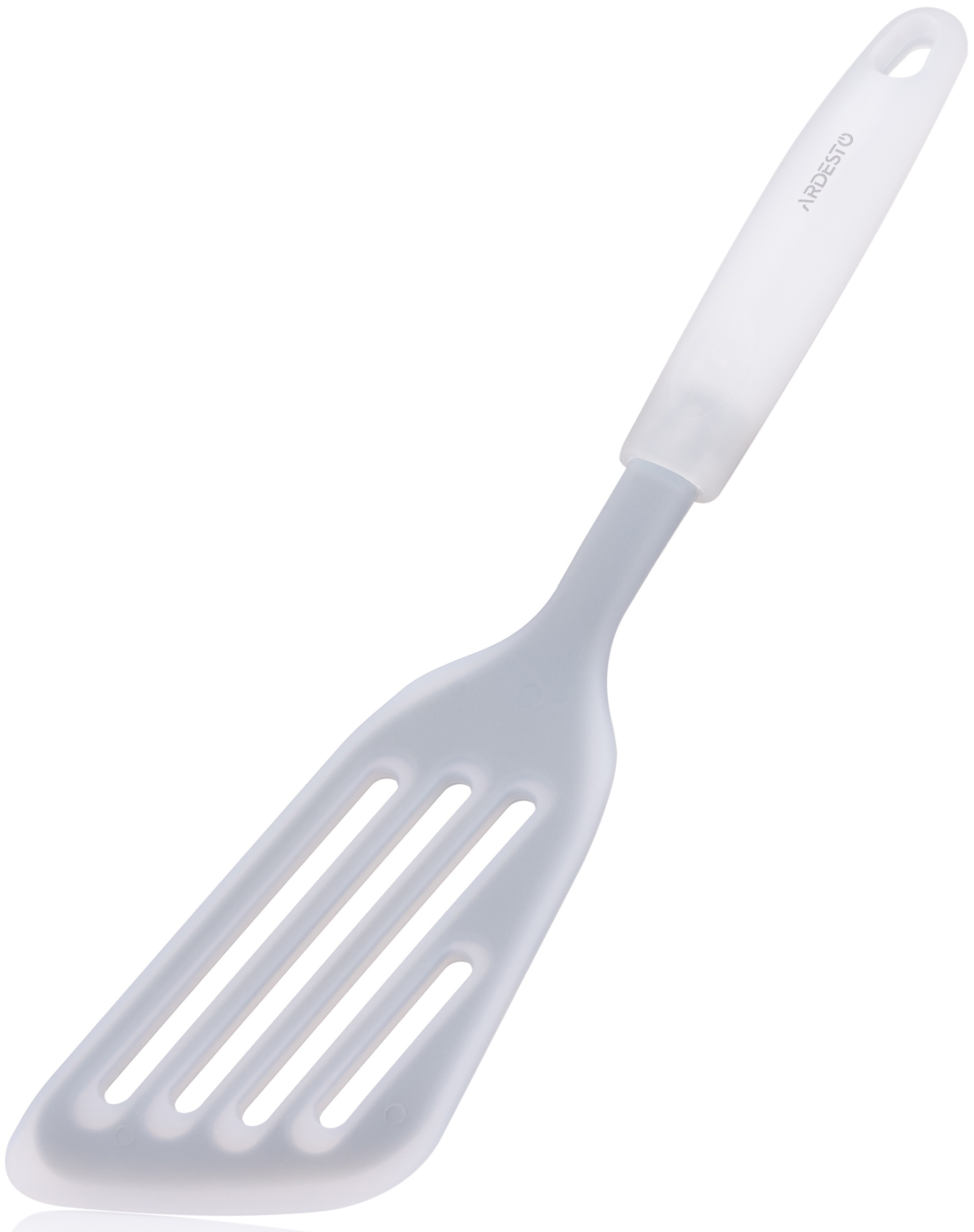 ARDESTO Fresh slotted spatula is a reliable helper in the kitchen. The spatula made of nylon and silicone will not damage the surface of the dishes and can withstand high temperatures. The comfortable handle made of gray plastic ensures full concentration on cooking. The size is 32 × 7.5 cm. It is dishwasher safe.