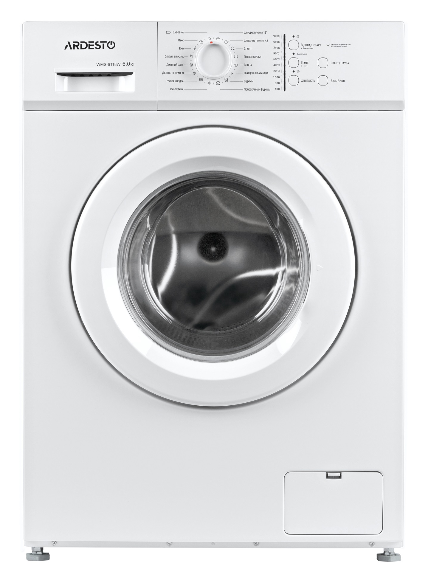 Fully automatic front loading washing machine in white colour. Ardesto WMS-6118W is intended for loading 6 kg of linen. The maximum spin speed reaches 1000 revolutions per minute, and the energy saving class is A++. There are 16 wash programs available for different types of fabric and degree of soiling.