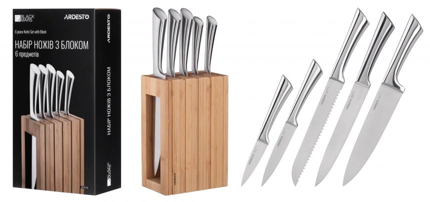 Серії ARDESTO Black Mars AR2020SW, AR2021SB та ARDESTO Gemini AR2106SS орієнтовані на тих, хто цінує цілісну металеву конструкцію без додаткових накладок. У кожному комплекті є п’ять ножів: кухарський, універсальний, для хліба, для овочів і ніж-слайсер. Ножі повністю виготовлено з нержавіючої сталі, що гарантує гігієнічність і довговічність.