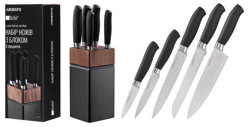 Серія ARDESTO Gemini доступна в кількох конфігураціях. Набір AR2105BL (6 предметів) виконано в чорному кольорі. Леза виготовлено з нержавіючої сталі 3Cr13. Такий матеріал забезпечує тривалу гостроту та стійкість до корозії. Руків’я з пластику з TPR-покриттям доповнено дерев’яною верхньою частиною, що гарантує надійний хват під час нарізання. У комплекті є блок для впорядкованого зберігання приладдя.