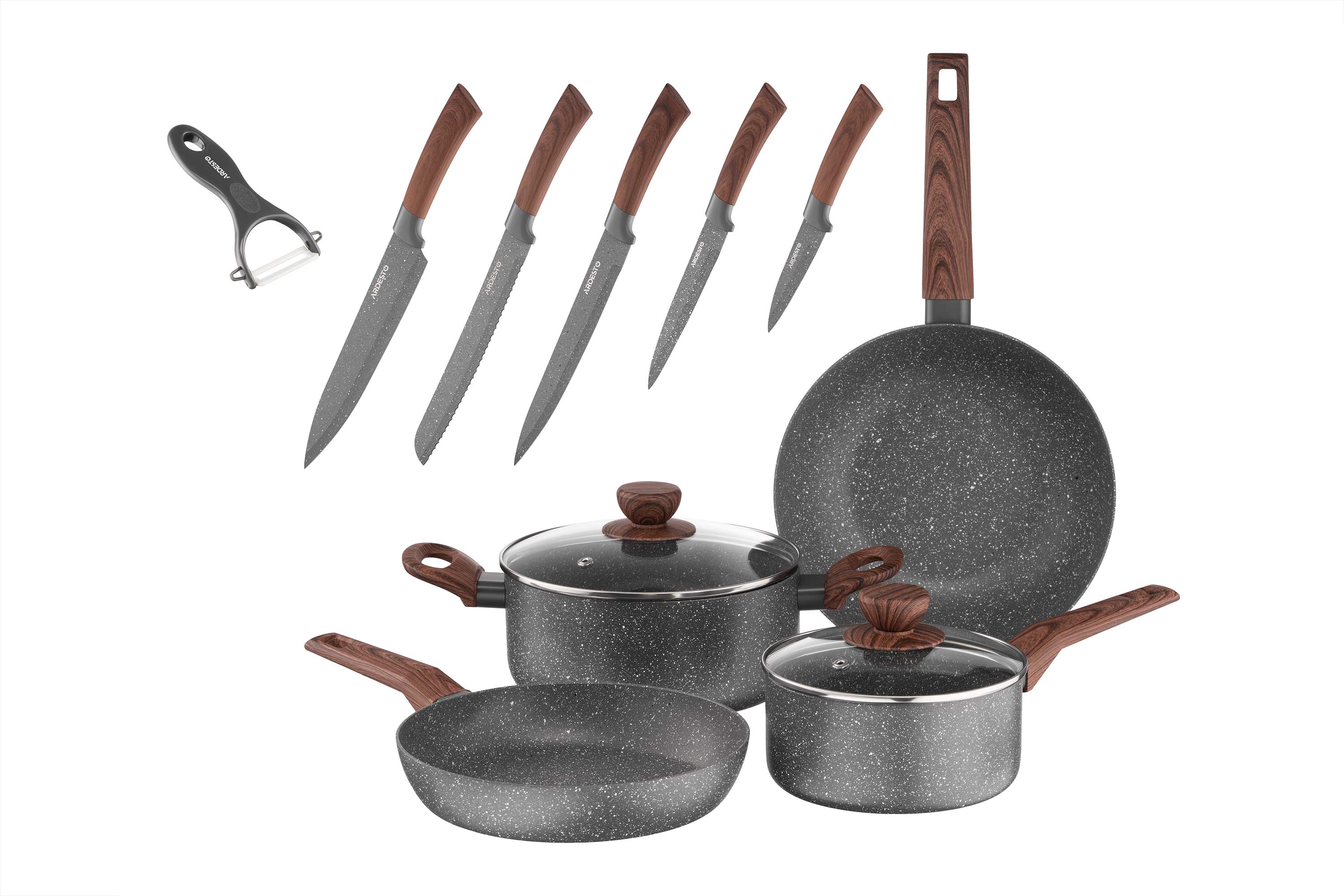 Готувати простіше та приємніше, якщо все необхідне є напохваті. А коли кухонне приладдя виготовлене в єдиному стилі та задовольняє всі вимоги кулінара – найвища насолода. Саме тому увагу привертають набори посуду, як ARDESTO Midori. Набір містить 12 предметів, з-поміж яких: ківш (1,6 л) з кришкою, каструля (2,5 л) з кришкою, сковорода (22 см), сковорода ВОК (24 см), ніж кухарський (20 см), ніж для хліба (20 см), ніж слайсерний (33 см), ніж універсальний (12,7 см), ніж для овочів (9 см), овочечистка (12,5 см) з керамічним лезом. Каструлю, ківш і сковороди виготовлено з алюмінію, оснащено зручними ручками з бакеліту з Soft-touch-покриттям. Сумісні з газовими, електричними, склокерамічними, галогенними й індукційними плитами. Леза ножів виготовлено з нержавіючої сталі, вони не потребують додаткового заточування протягом тривалого часу. Ергономічне пластикове руків’я комфортно лягає, не вислизає та гарантує безпеку під час роботи. Елементи набору не призначені для миття в посудомийній машині.