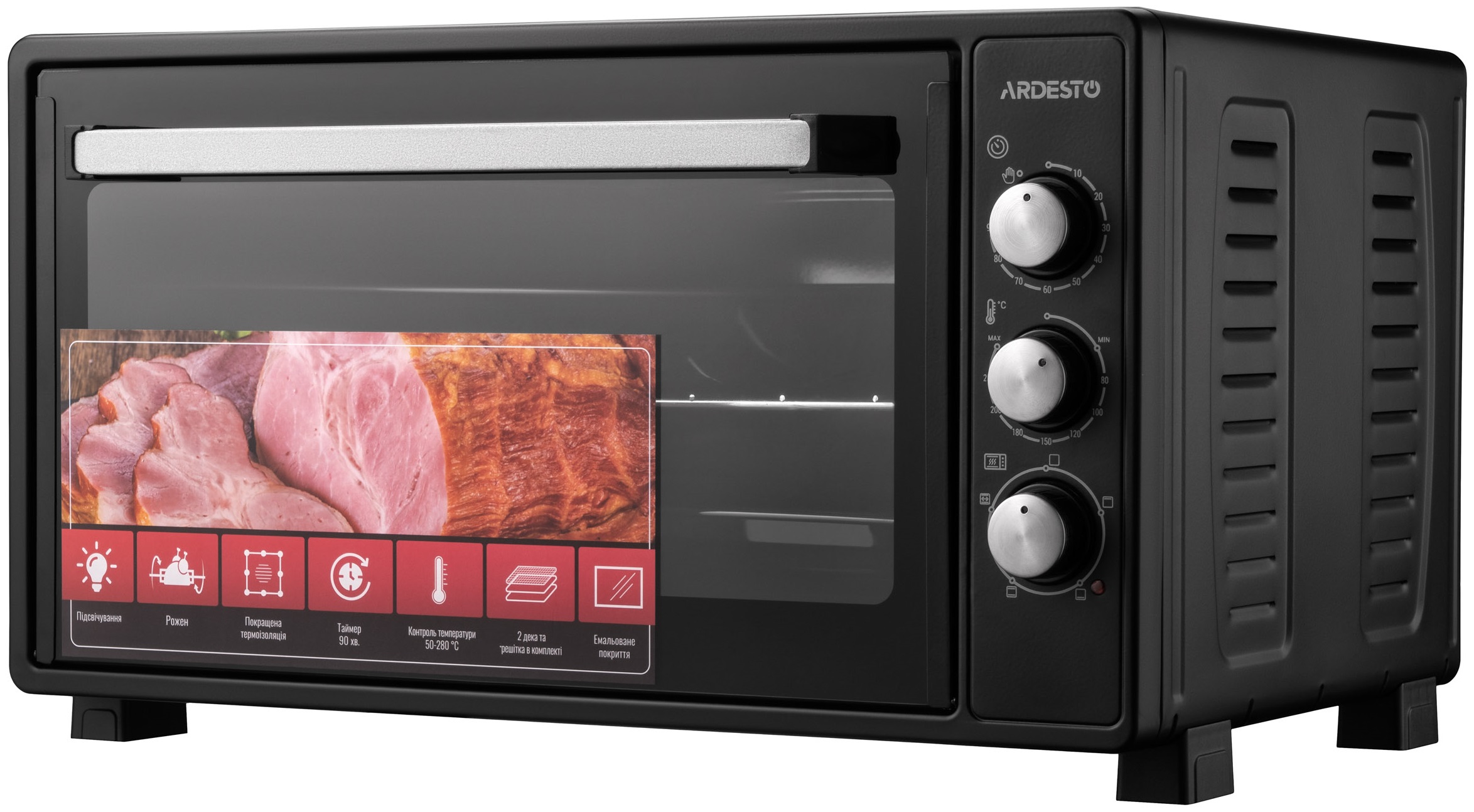 Завдяки широкому температурному діапазону – від 50 до 320 °C – можна точно регулювати тепловий режим для приготування найрізноманітніших страв. Пічку оснащено вбудованим таймером на 90 хвилин, який допомагає контролювати час готування й автоматично вимикає пристрій після його закінчення.У комплекті надається рожен, із яким можна готувати смачне м’ясо із золотистою скоринкою, а ще прямокутне й кругле дека, решітка для гриля.