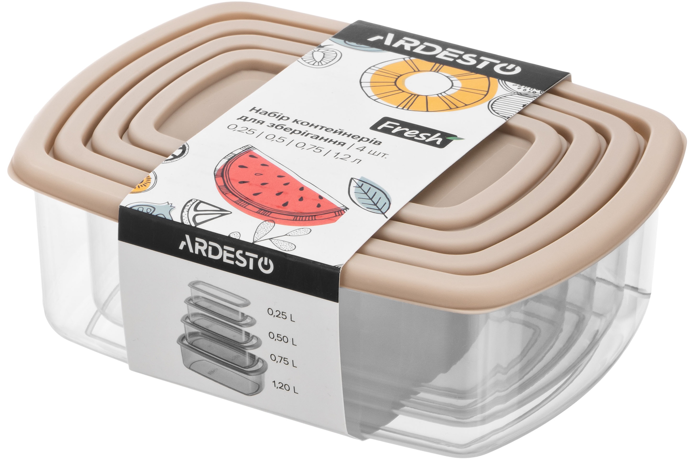 Набір контейнерів для зберігання харчових продуктів ARDESTO Fresh 0.25/0.5/0.75/1.2л, пластик, прямокутна, бежевий