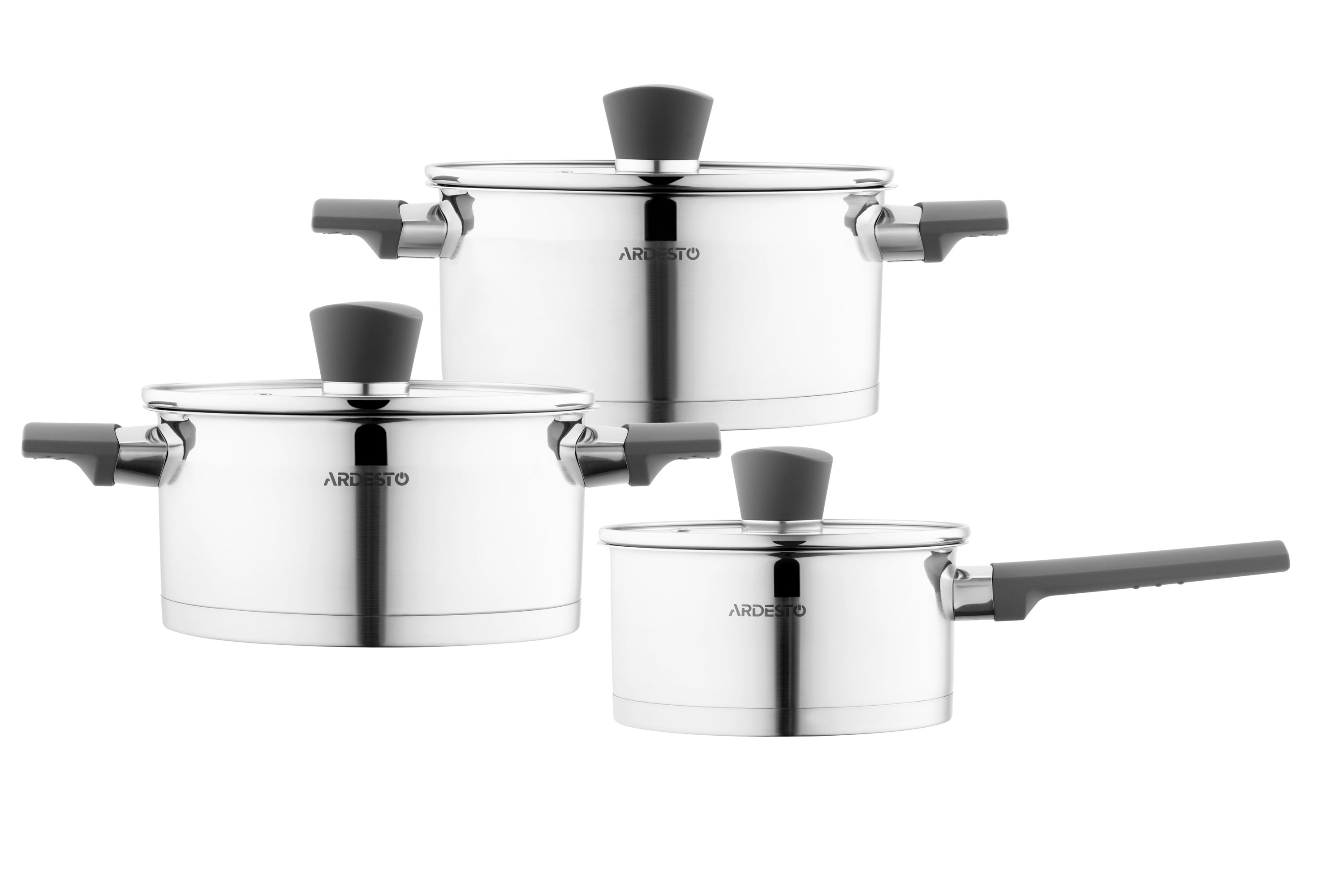 Елементи набору ARDESTO Gemini – ківш (1,5 л), каструлі (2,1; 3 л) – виготовлено з якісної нержавіючої сталі товщиною 0,5 мм із дзеркальною поверхнею, що не окислюється під час використання та не вступає в реакцію з їжею навіть за високої температури. Дно товщиною 2,5 мм забезпечує рівномірний розподіл тепла.