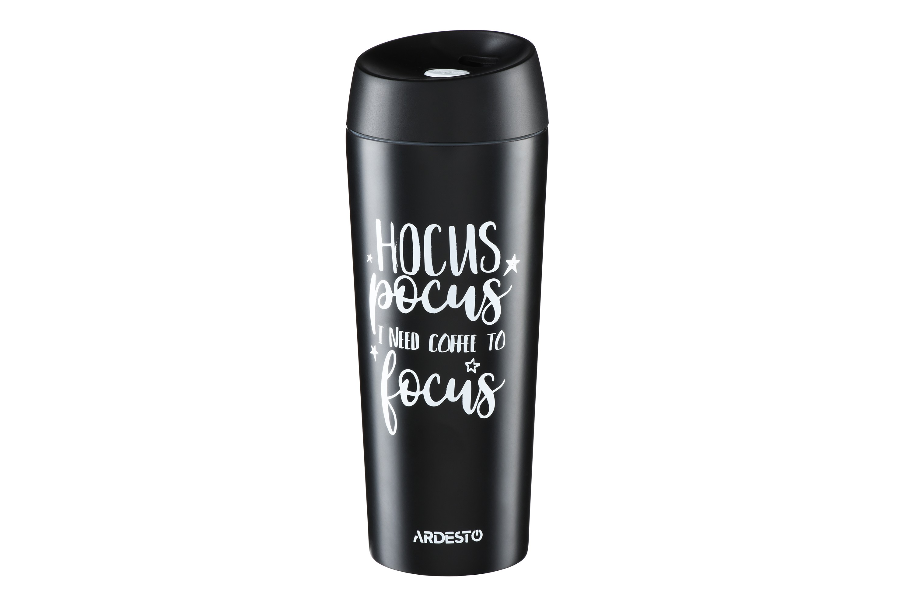 Термочашка на 450 мл з вакуумною технологією зберігання температури – до 8 годин для гарячих напоїв, та 12 годин для холодних. Зовнішня металева частина пофарбована у чорний колір з матовою текстурою та написами білого кольору. Внутрішня частина виконана з нержавіючої сталі 18/10. Нековзка основа запобігає перевертанню, а пластикова кришка отримала силіконову прокладку та кнопку відкриття отвору для пиття.