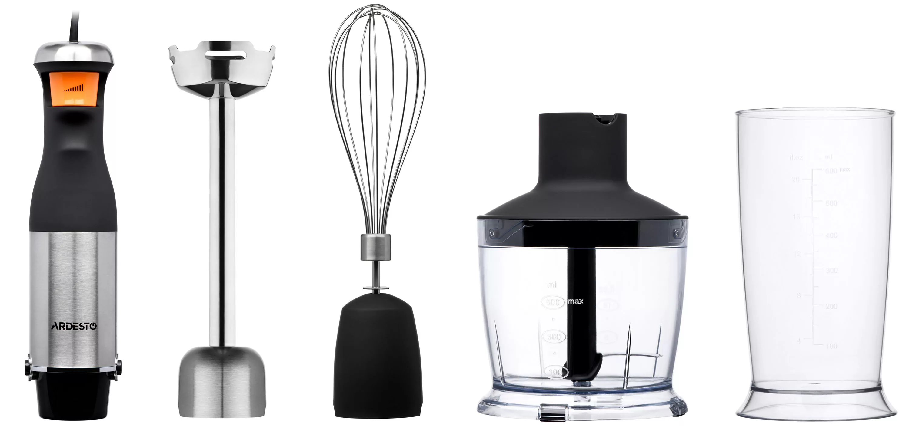 В комплектацию входит мерный стакан на 600 мл и металлическая насадка для смешивания, чаша на 500 мл для измельчения, а также веничек для взбивания. С таким набором можно быстро подготовить ингредиенты для сложных блюд, сделать коктейль или смузи, а также сбить тесто для выпечки и блинов или смесь для омлета.