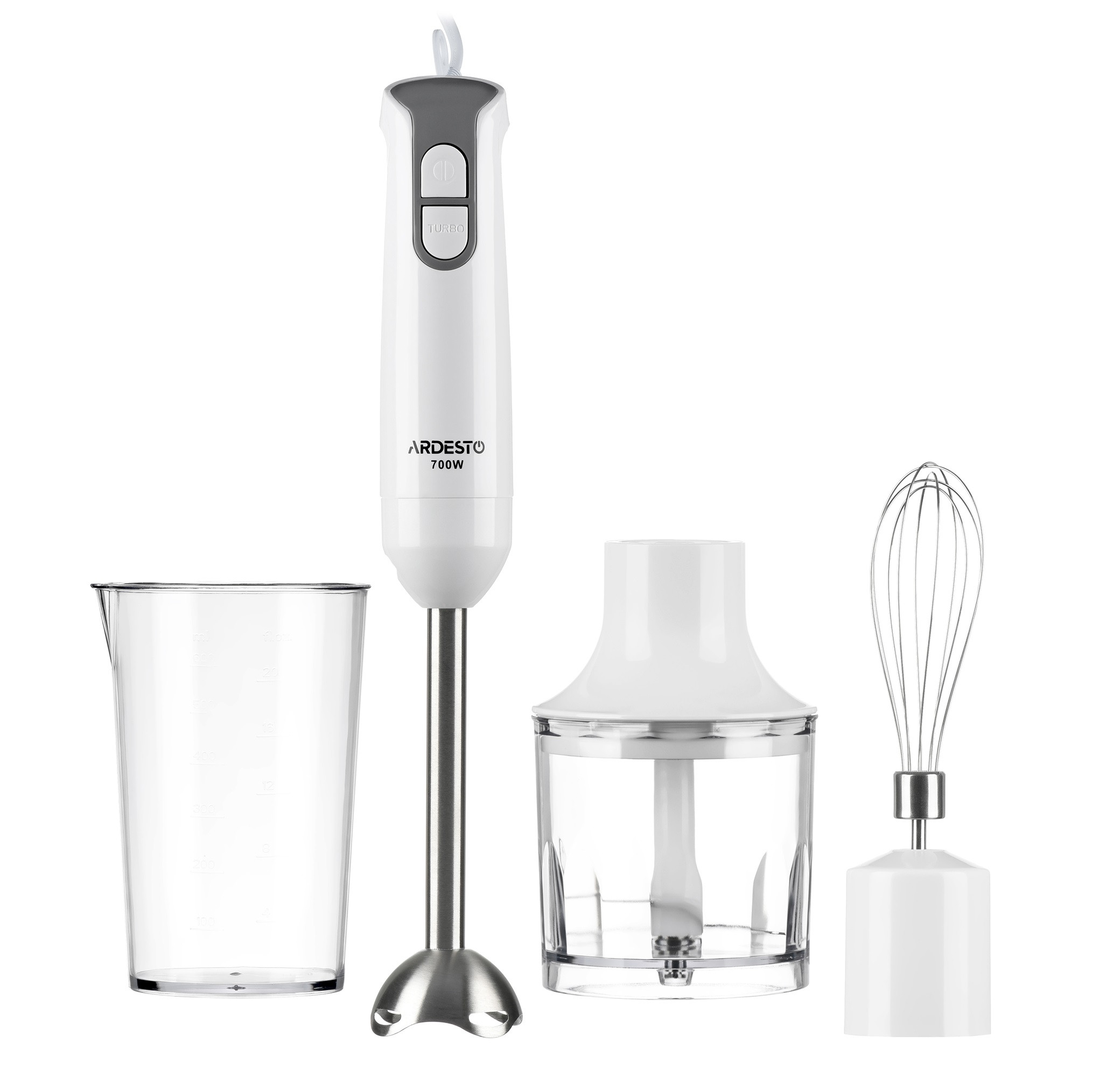 В комплектацию входит мерный стакан на 600 мл и металлическая насадка для смешивания, чаша на 300 мл для измельчения, а также венчик для взбивания. С таким набором можно быстро подготовить ингредиенты для сложных блюд, сделать коктейль или смузи, а также замесить тесто для выпечки и блинов или смесь для омлета.