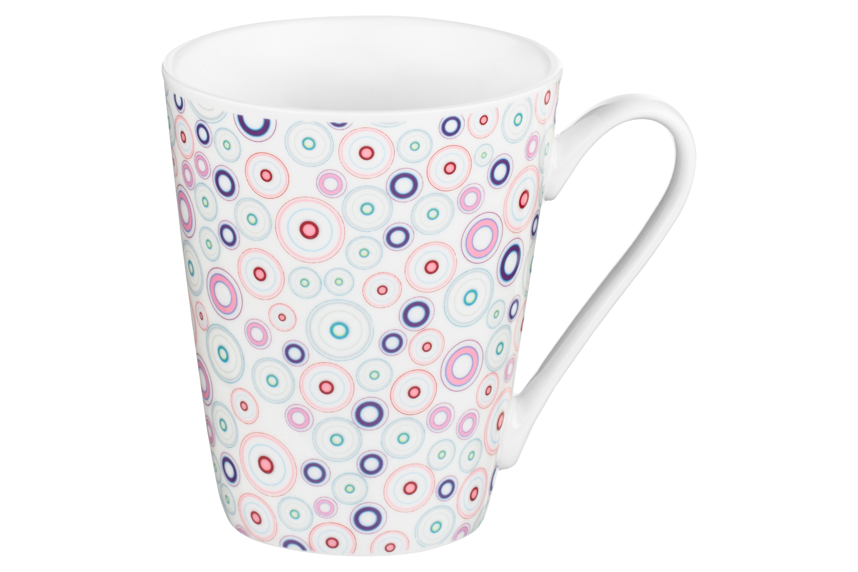 Фарфоровая чашка украшенная умиротворяющими изображениями кругов разных размеров и цветов на белом фоне. Создает уютную атмосферу и улучшает настроение. Высотой 10,3 см и объемом 320 мл – ее удобно держать одной рукой, она подойдет для различных горячих напитков. Можно мыть в посудомоечной машине и использовать в микроволновке.
