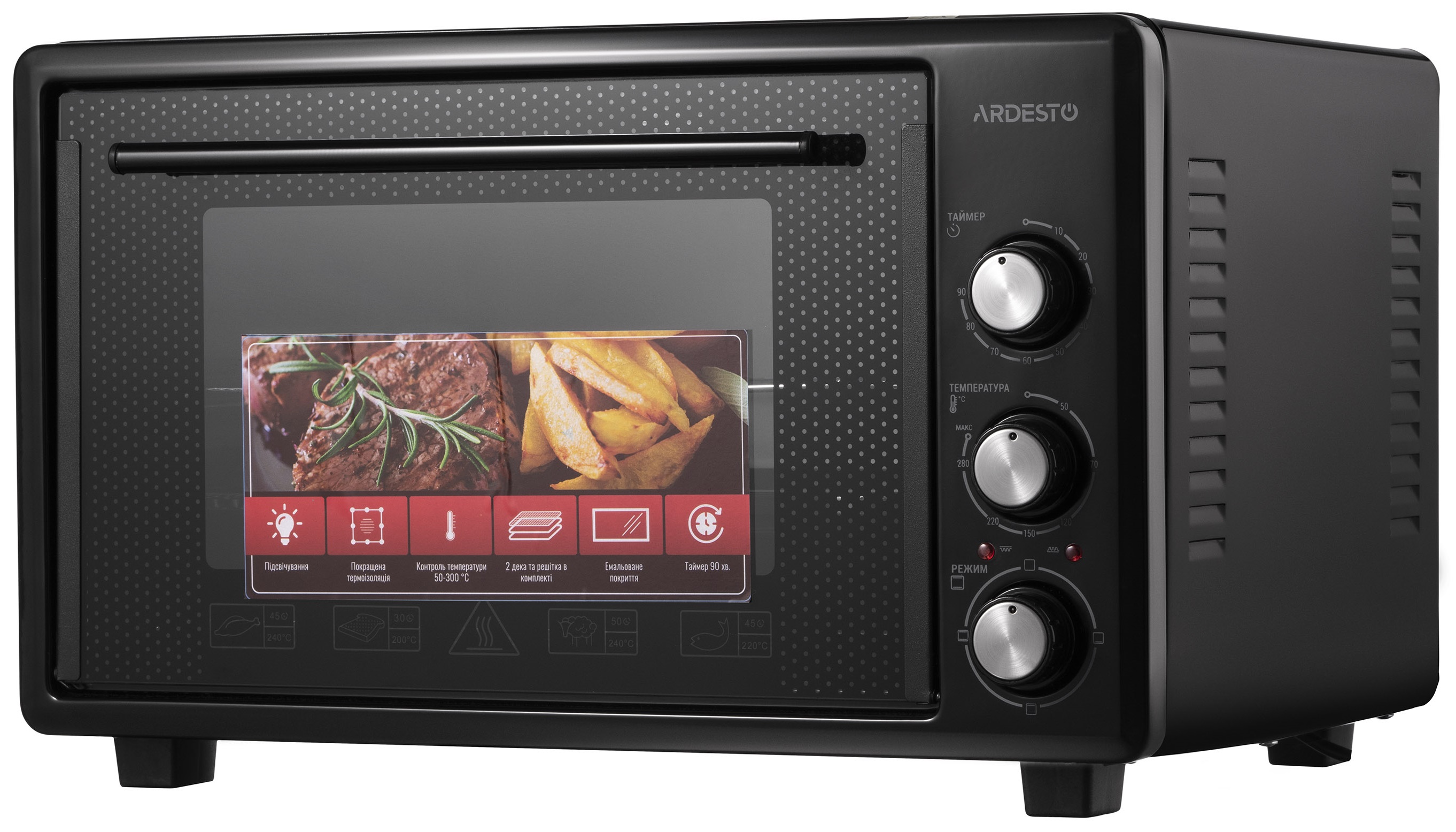Дверца печи изготовлена из закаленного стекла, а справа от них на передней панели встроены три колесика для настройки устройства. Внутренняя камера объемом 40 л имеет эмалированное покрытие и освещение. Одной из особенностей модели является скрытый нижний нагревательный элемент и это не влияет на мощность устройства, составляющую 1 300 Вт. В целом печь ARDESTO достаточно компактная (345×518×400 мм), поэтому для нее обязательно найдется место даже на маленькой кухне.