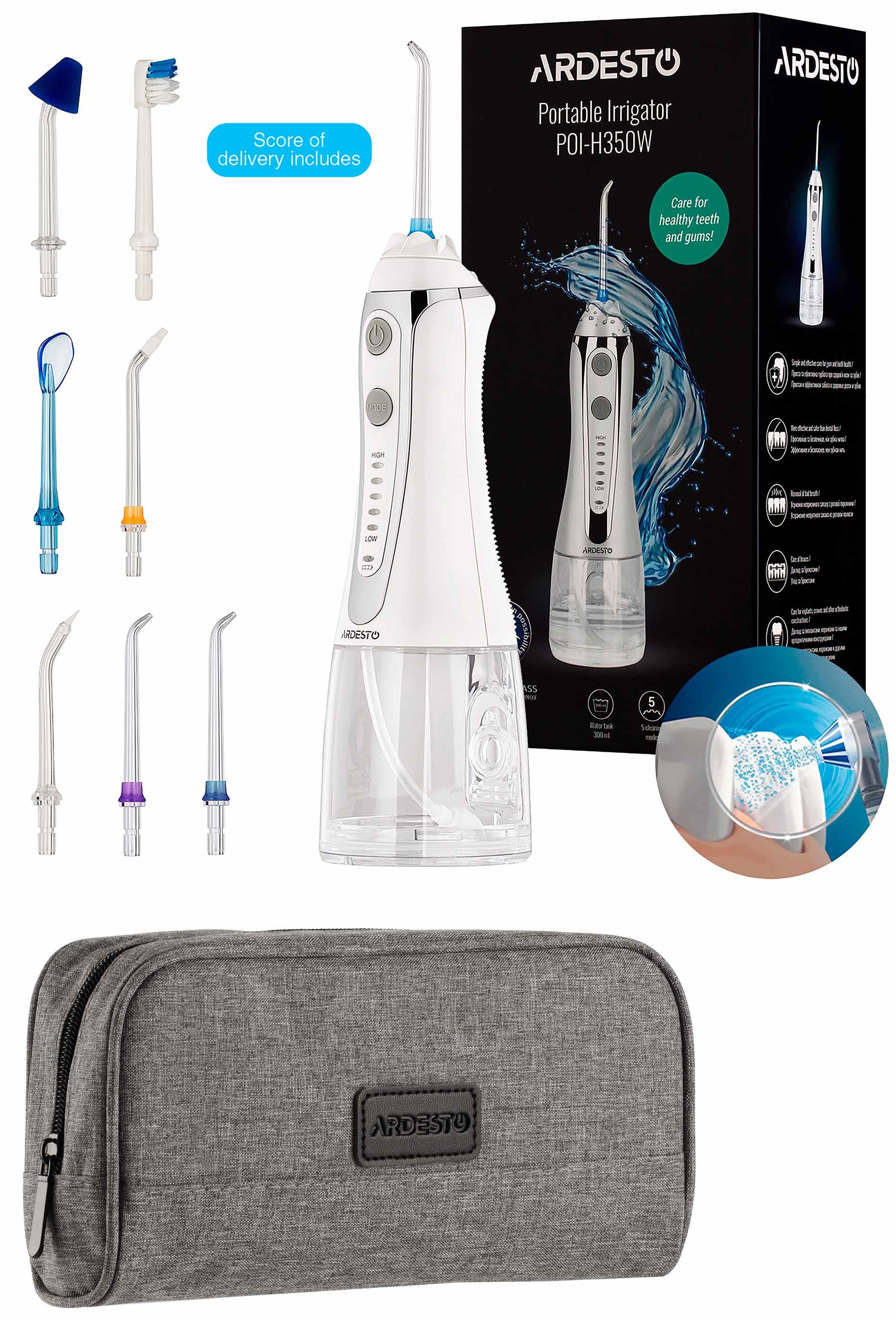 КомплектацияИрригатор / Емкость для воды / Зубная щетка / классическая насадка 2 шт / ортодонтическая насадка / пародонтологическая насадка / Насадка для чистки языка / насадка для увлажнения носа POI-H350W-SNT / кабель питания / блок питания / чехол / бокс для хранения насадок