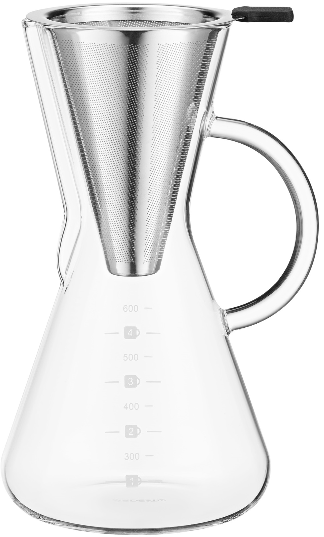 Кемекс для заваривания кофе ARDESTO Black Mars изготовлен из качественного боросиликатного стекла, имеет фильтр из нержавеющей стали. При диаметре дна 11 см и высоте 20 см объем составляет 600 мл, чего вполне достаточно для одновременного приготовления нескольких порций любимого напитка. Диапазон термостойкости – от -20 до +150 °C, к тому же кемекс пригоден к мытью в посудомоечной машине.