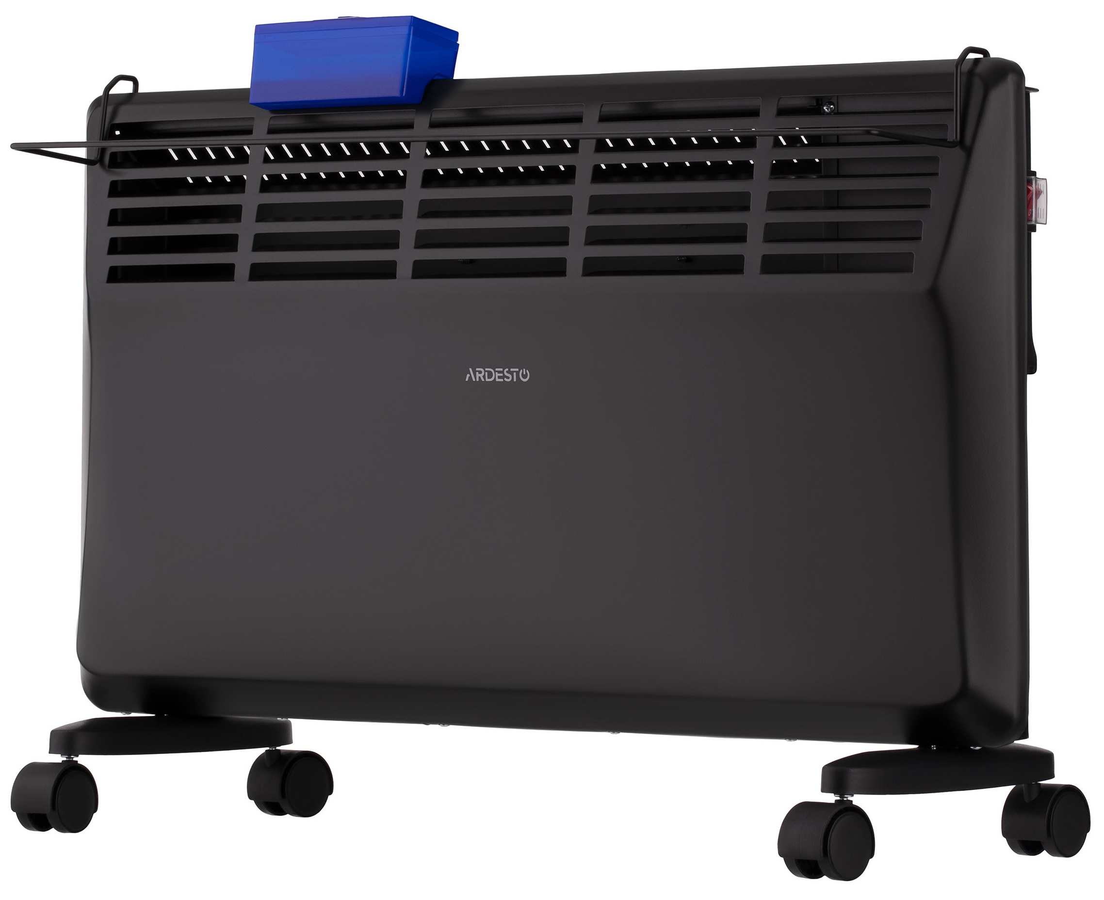 Электрический конвектор с механическим управлением черного цвета, классом защиты IP20 и двумя режимами мощности 1000/2000 Вт. Рассчитан на обогрев помещений площадью до 20 м2. Класс энергозащиты – первый. В этой модели предусмотрена сушка и контейнер для естественного увлажнения воздуха. Есть защита от перегрева и датчик от опрокидывания. Эта модель обогревателя имеет два типа монтажа – настенный и напольный. Кронштейны и опоры с колесиками для напольной установки поставляются в комплекте с обогревателем.
