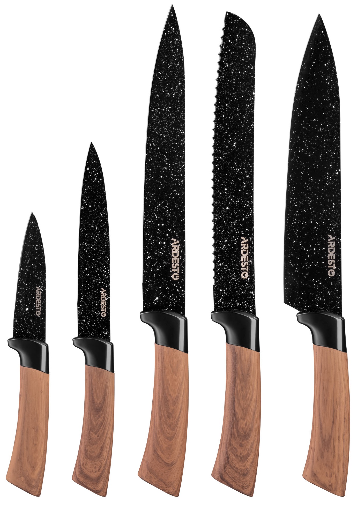 Стильный набор ножей дополнит любой кухонный интерьер и станет незаменимым помощником для повседневного использования. В наборе есть самые востребованные: нож повара (20,3 см), нож для хлеба (20,3 см), нож слайсерный (20,3 см), универсальный нож (12,7 см) и нож для чистки овощей (8,9 см).