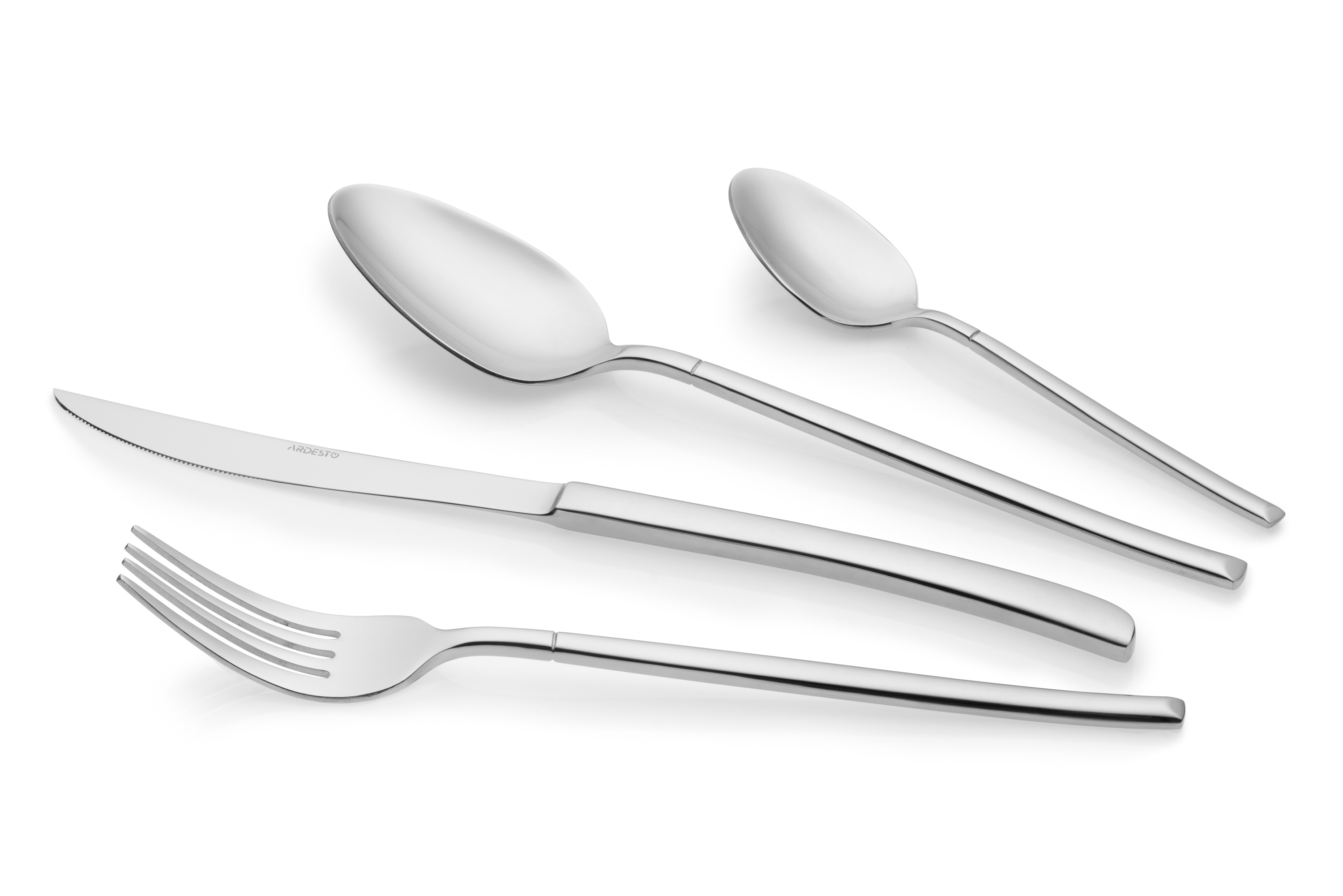 Набор столовых принадлежностей с 24 предметов. Включает: ложки, вилки и ножи. Принадлежности выполнены из нержавеющей стали с зеркальной полировкой.