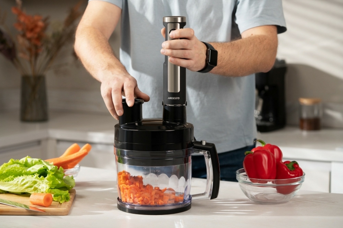 Погружной блендер HBSG-1000WHCHSL (1 000 Вт, набор 7 в 1) с чашей 2 000 мл и насадкой для нарезки кубиками позволяет быстро подготовить ингредиенты как для праздничных, так и повседневных блюд.