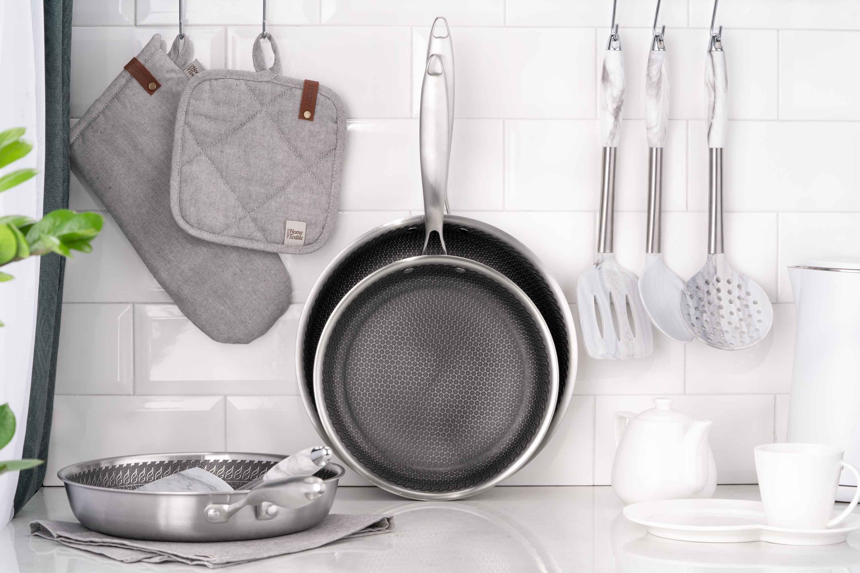 Ці сковороди з нержавіючої сталі виготовлено за технологією Triply, яка поєднує кілька шарів металу для рівномірного нагрівання та стійкості до деформації. Протипригарне покриття відзначається стійкістю до подряпин, тож можна використовувати навіть металеві аксесуари. Сковороди сумісні з усіма типами плит і придатні для миття в посудомийній машині.
